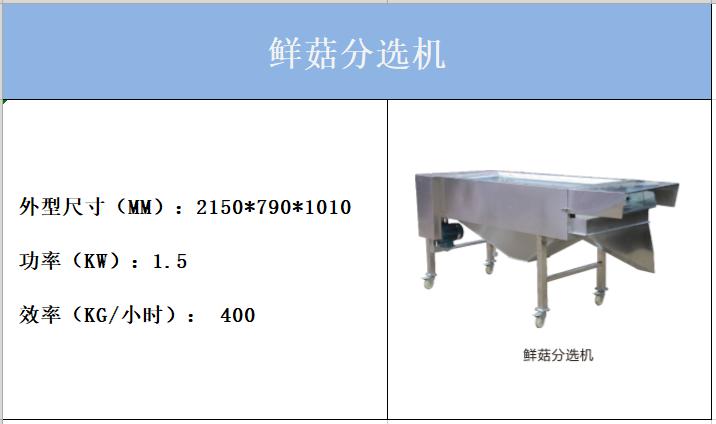 逸村鮮菇篩選機設(shè)為2層,即2層篩網(wǎng),外形尺寸:2150*790*1010mm,功率:1.5kw,工作效率可達400kg/小時。